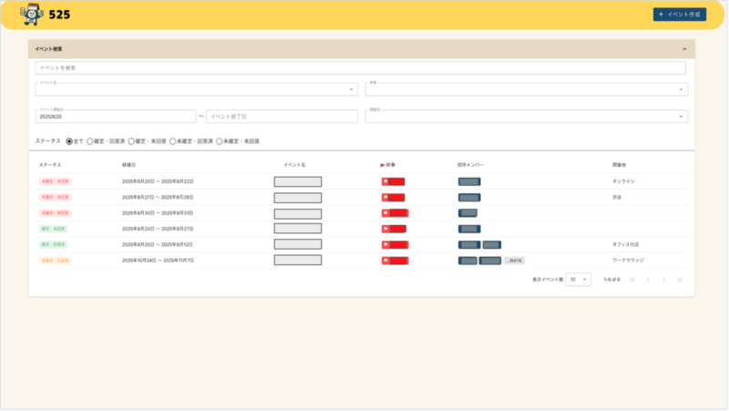 自分が参加しているイベントを一覧で確認できます。また、イベントが確定しているのか・自分が出欠を提出したのかを一目で確認できるステータスが表示されています。